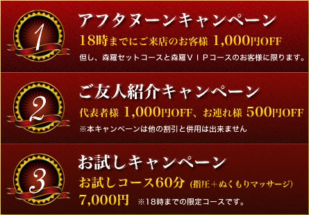 ◇年末年始♪お客様大感謝祭◇ くじを引いて当たれば、その場すぐ使える豪華賞品プレゼント 期間:1月31日火曜日 ◇アフタヌーンキャンペーン◇ 18時までにご来店のお客様 1,000円OFF ※森羅セットコースと森羅VIPコースのお客様に限ります。 ◇ご友人紹介キャンペーン◇ 代表者 1,000円OFF お連れ様 500円OFF ※本キャンペーンは他の割引との併用は出来ません。 ◇お試しキャンペーン◇ お試しコース60分(指圧+ぬくもりマッサージ) 7,000円 18時までの限定です。